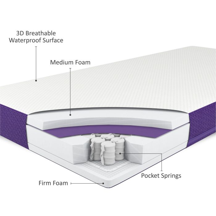 The Duo mattress features a sophisticated pocket sprung core, tailored to provide progressive support for baby as they grow and develop into toddlerhood.