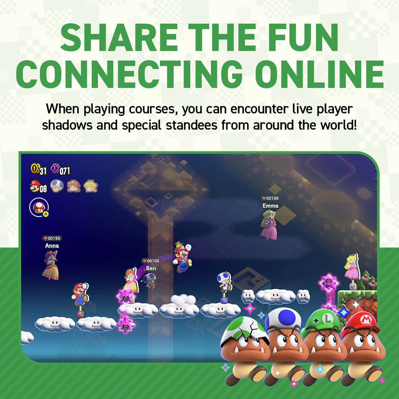 Share the wonder with friends and Mario fans. Team up with up to three friends locally and gather around one Nintendo Switch console to experience the game-bending Wonder Effects together as you tackle courses as a team and help each other on your way to the goal.