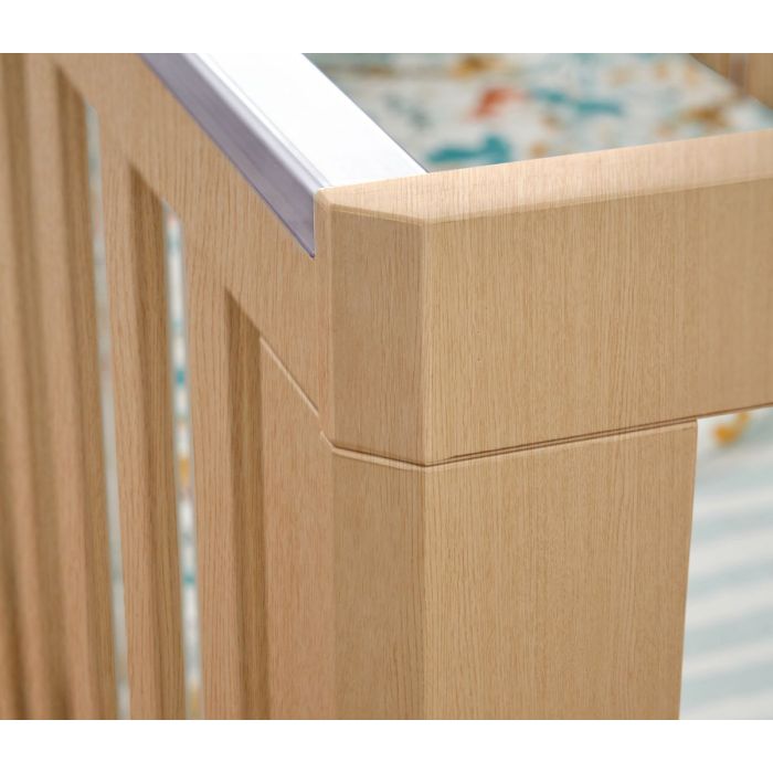 A Scandinavian inspired blend of modern simplicity and functionality. With bevelled corners, splayed legs and slatted cot ends, it’s an ideal choice for those who desire a minimalistic, contemporary nursery look.