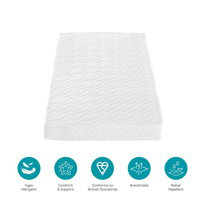 A comfortable, supportive baby cot mattress supports a natural posture. The mattress has individual pocket springs to support your baby’s entire body as they grow. Has a quilted cover made from fresh tech fabric to ensure your little one feels cool and comfortable, Ensure your little one gets a peaceful night’s sleep.